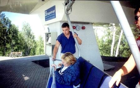 Когда автобус прибыл на место, нас уже ждала девушка-экскурсовод. Любезные сотрудники фан-парка помогли нам дойти до площадки, приостановили подъёмник и усадили в удобные кресла. И начался подъём. Чувства, которые мы при этом испытали, трудно передать словами. Ощущение медленного полета, когда ты летишь мимо деревьев, мимо высоких сосен и березок, а ветки иногда проплывают так близко, что хочется дотронуться рукой, было поистине волшебным. А немного оглянувшись, можно было увидеть, что Красноярск медленно удаляется и уменьшается, и со временем открывается вашему взору весь, как на ладони. Вот я вижу наш Енисей — широкий, небесно голубой. А вот, как гусеница, через него перекинулся, Коммунальный мост. Слева белеют новостройки Академгородка.