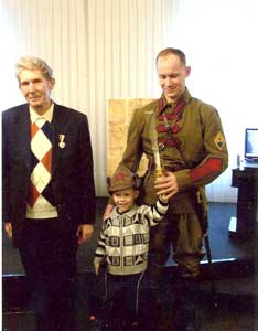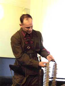 Тем не менее далеко не все молодые послушно внимают тем, кто с начала 90-х принялся по-иному трактовать важнейшие события нашей истории. Ярким моментом презентации стало появление перед её участниками молодого соратника Вениамина Степановича, историка по образованию Дмитрия Семёнова в форме и оснащении красноармейца со значками отличия командира отделения образца 1922 года – с настоящими шашкой и револьвером бельгийского производства 1870 года выпуска. Он продемонстрировал также 3-дюймовый французский снаряд 1915 года, найденный на месте шипкинских сражений близ деревни Бирюса, немецкую гранату 1913 года, ленту от легендарного пулемёта «Максим» и патроны «Кайнок» 1917 года выпуска. Практически весь этот арсенал, использовавшийся тасеевцами, был обнаружен поисковиками-энтузиастами в районах боёв между сибирскими партизанами и белогвардейцами. Лично меня больше всего поразили сапоги 20-х годов выпуска, которые настолько хорошо сохранились, что смотрелись на Дмитрии почти как новые!