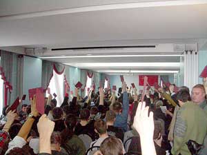 НЕСМОТРЯ на довольно различные взгляды и идеологии всех левых, собравшихся в зале, сама конференция прошла в очень конструктивном русле, и сомнений в том, что несистемным левым пора начать плотную работу сообща, практически не возникало. Жаркая дискуссия разгорелась лишь вокруг того, стоит ли действовать в рамках единого координационного совета, как предложил один из лидеров «Другой России», писатель-нацбол Эдуард Лимонов, либо объединиться в единый Левый фронт, как это предложил руководитель АКМ Сергей Удальцов. По этому вопросу окончательного решения не принималось, и решать его левым придётся скорее всего в рабочем порядке. Отдельно участники конференции отметили, что их целью является не борьба с КПРФ, которая подвергалась довольно жёсткой критике за свою безынициативную позицию в последние годы, а создание реальной альтернативы коммунистической партии и ведение политической борьбы в условиях честной конкуренции.