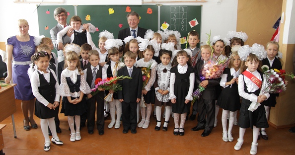 Вручил подарки от Законодательного Собрания победителям конкурса «Ученик года» Дарье Тяпкиной и Денису Лампелю. А 1 б класс попросил сделать снимок на память, и с депутатом, и с директором школы Виктором Борисовичем Томашевским, и с учительницей Верой Васильевной Вокиной. В добрый путь!